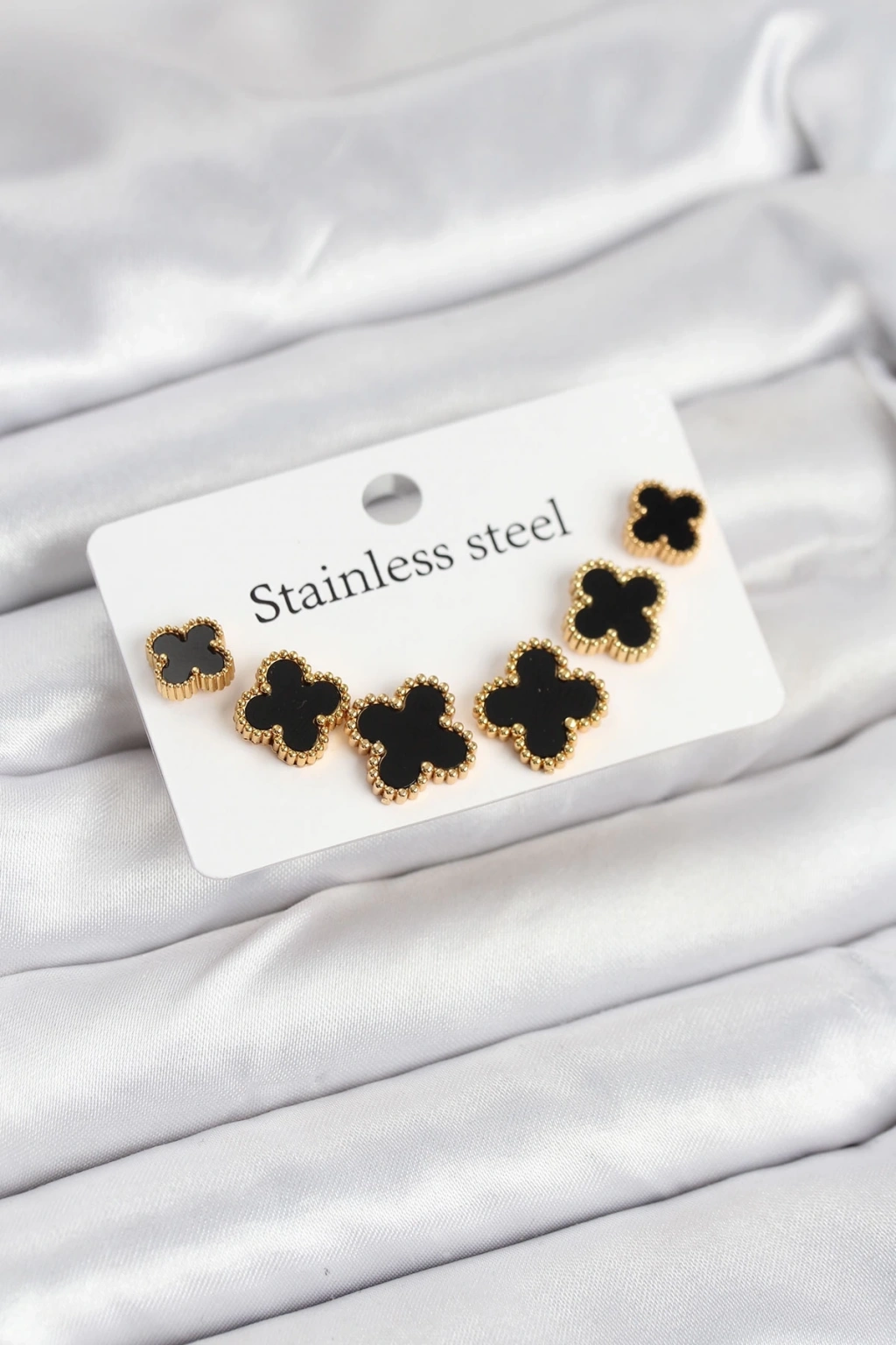 316L Çelik Gold Siyah Renk 3 Boy Yonca Küpe Seti
