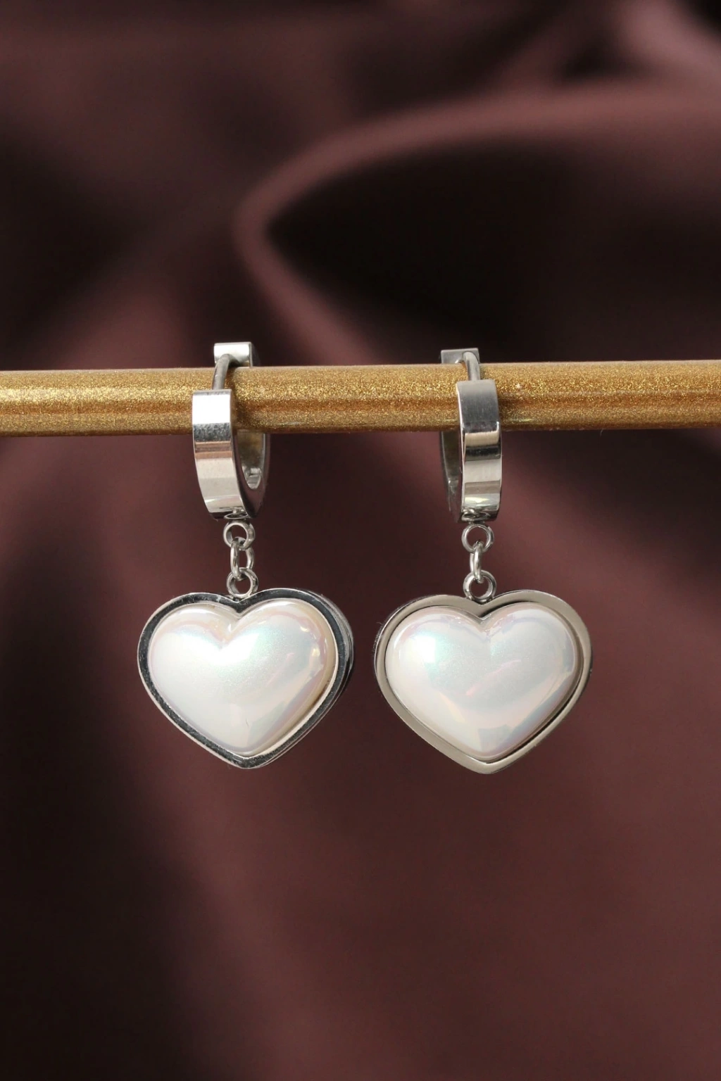 316L Çelik Gümüş Renk Beyaz Bombeli Kalp Küpe