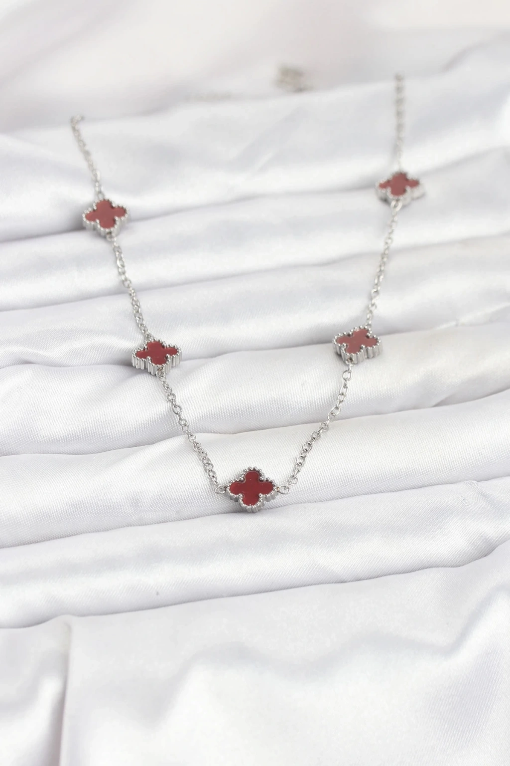 316L Çelik Zincir Gümüş Renk Bordo Baby Boy Yonca Kadın Kolye