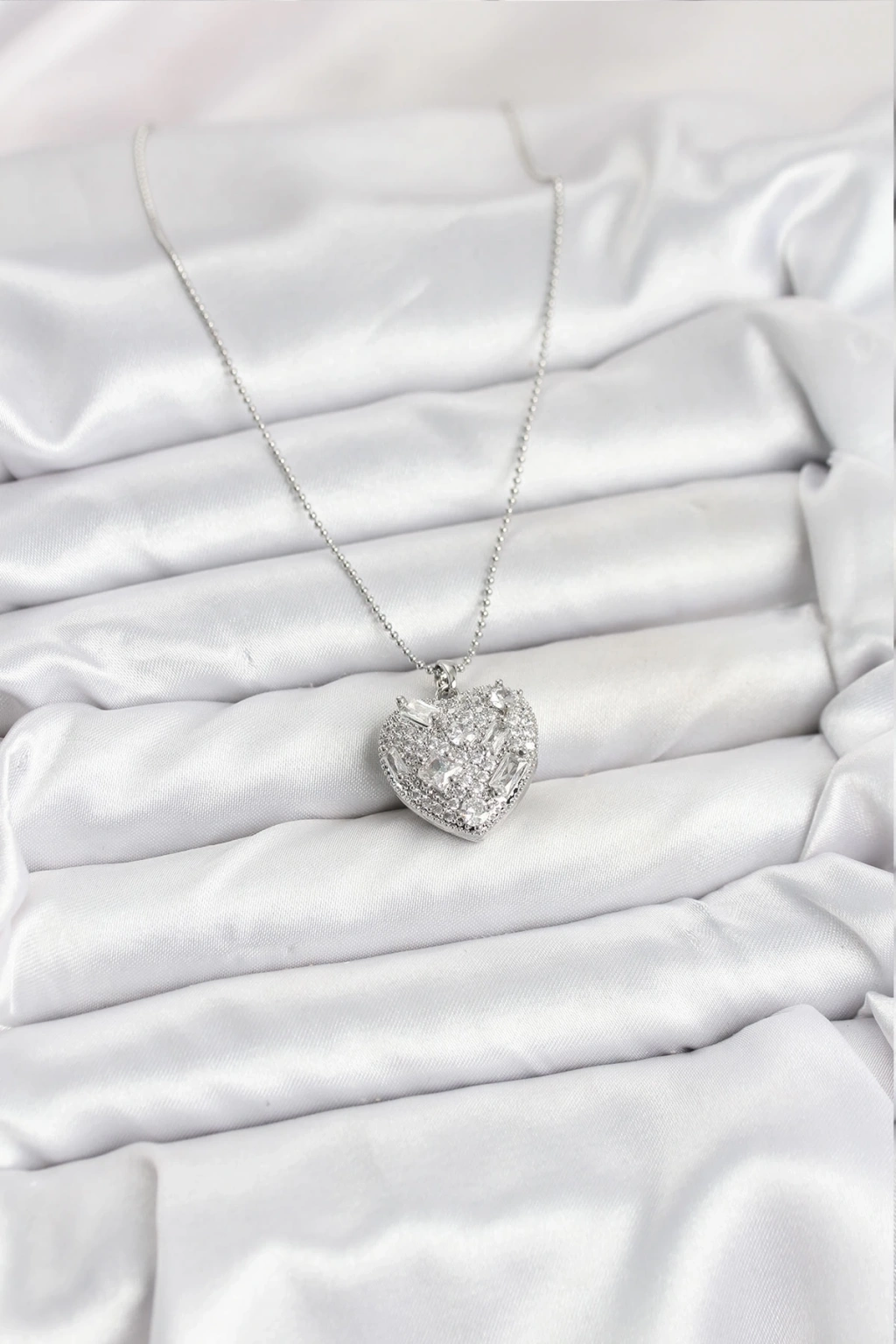 316L Çelik Zincir Gümüş Zirkon Taşlı Kalpli Kadın Kolye