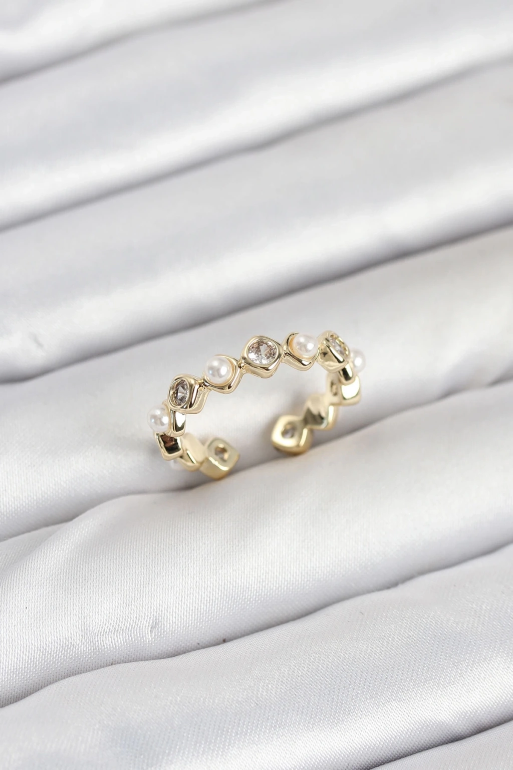 Pirinç Gold Renk Zirkon Taşlı İncili Kadın Yüzük