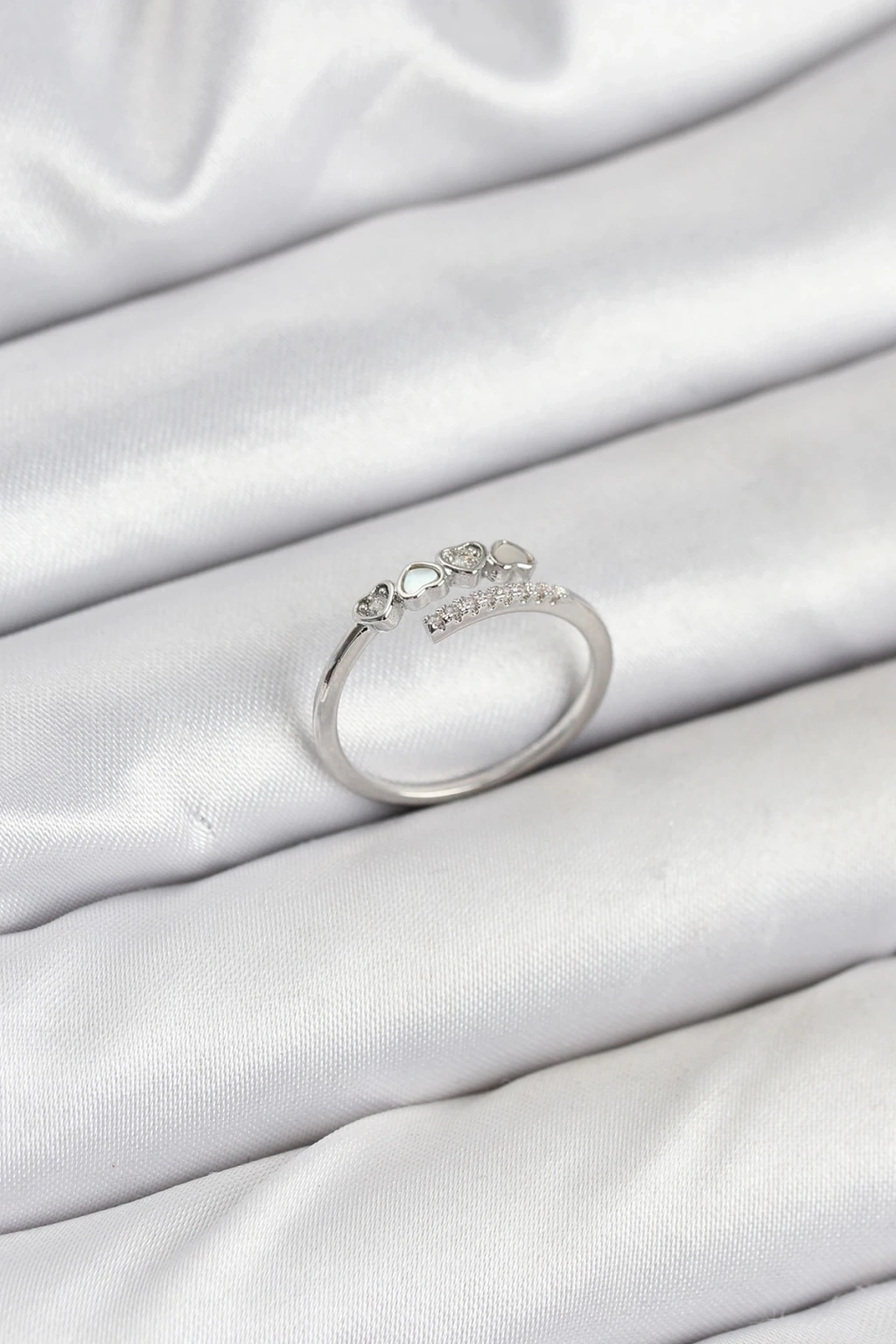 Pirinç Gümüş Renk Kalpli Detaylı Zirkon Taşlı Kadın Yüzük