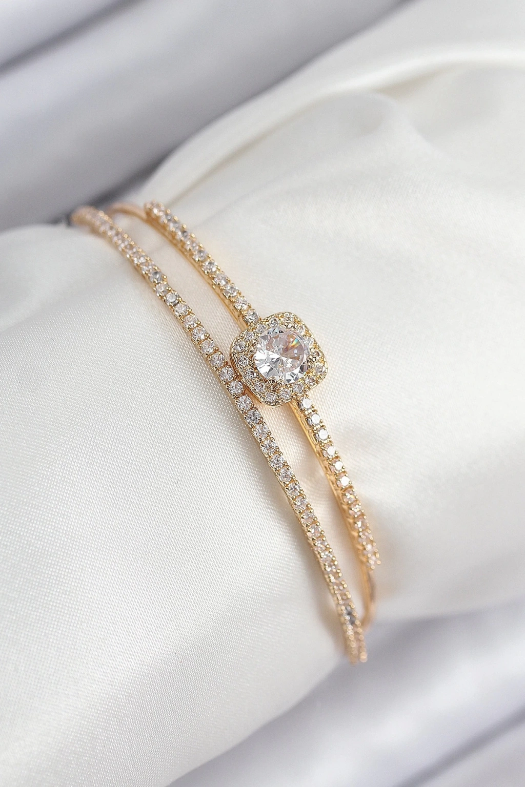 Pirinç Zirkon Taşlı Baget Model Gold Renk Kadın Bileklik