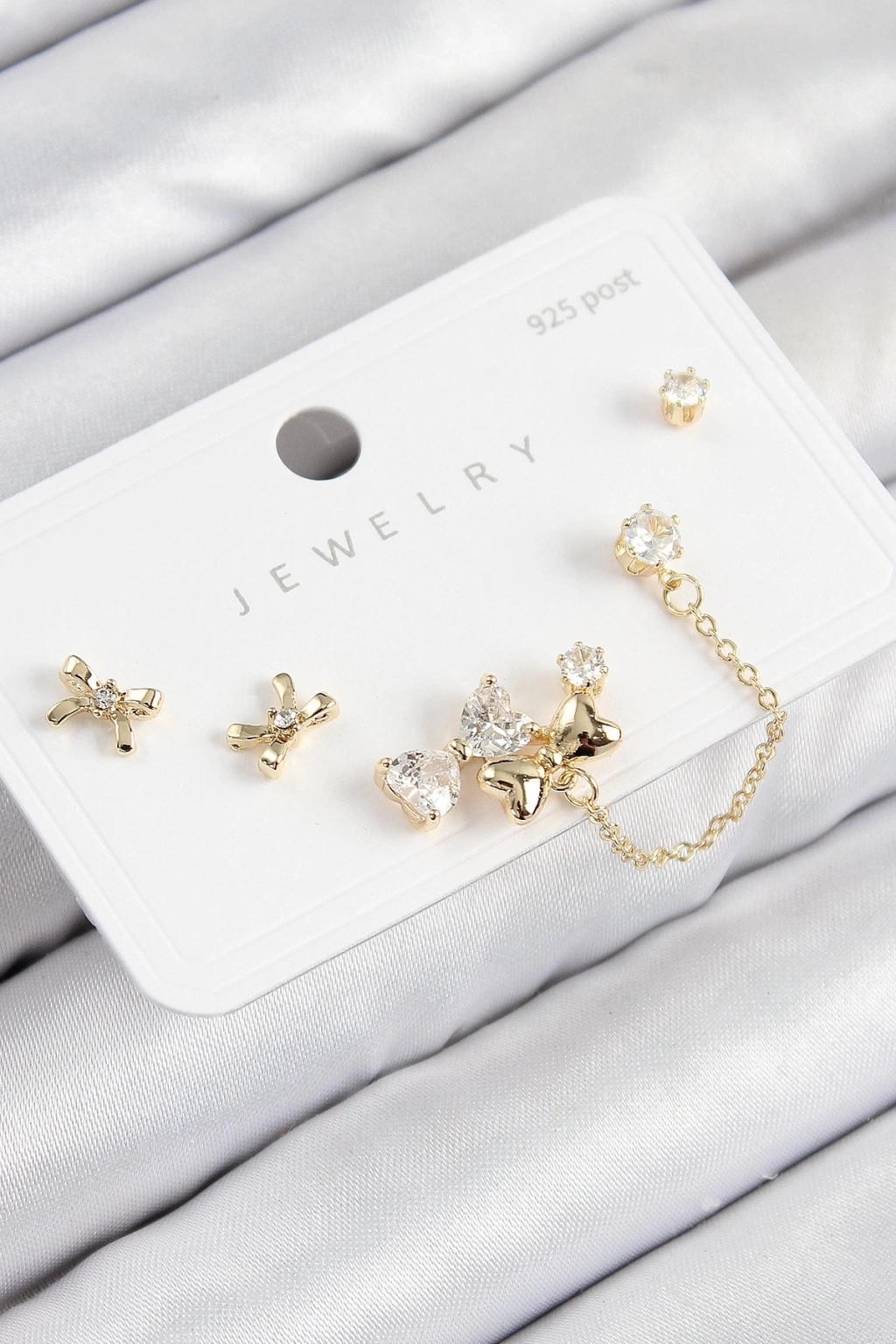 Pirinç Zirkon Taşlı Fiyonk Model Gold Renk 925 Ayar Gümüş Çivi Kadın Küpe Set
